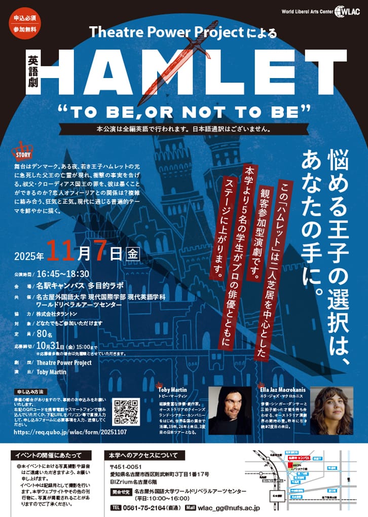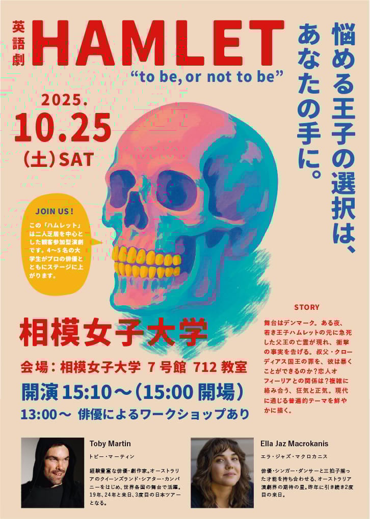 10月4日の徳島公演を皮切りに、1か月半で各地の幼稚園~大学まで巡回中。ご興味のある方は、相模女子大学(神奈川)、名古屋外国語大学(愛知)にて一般公開される『ハムレット』公演にぜひお越しください。